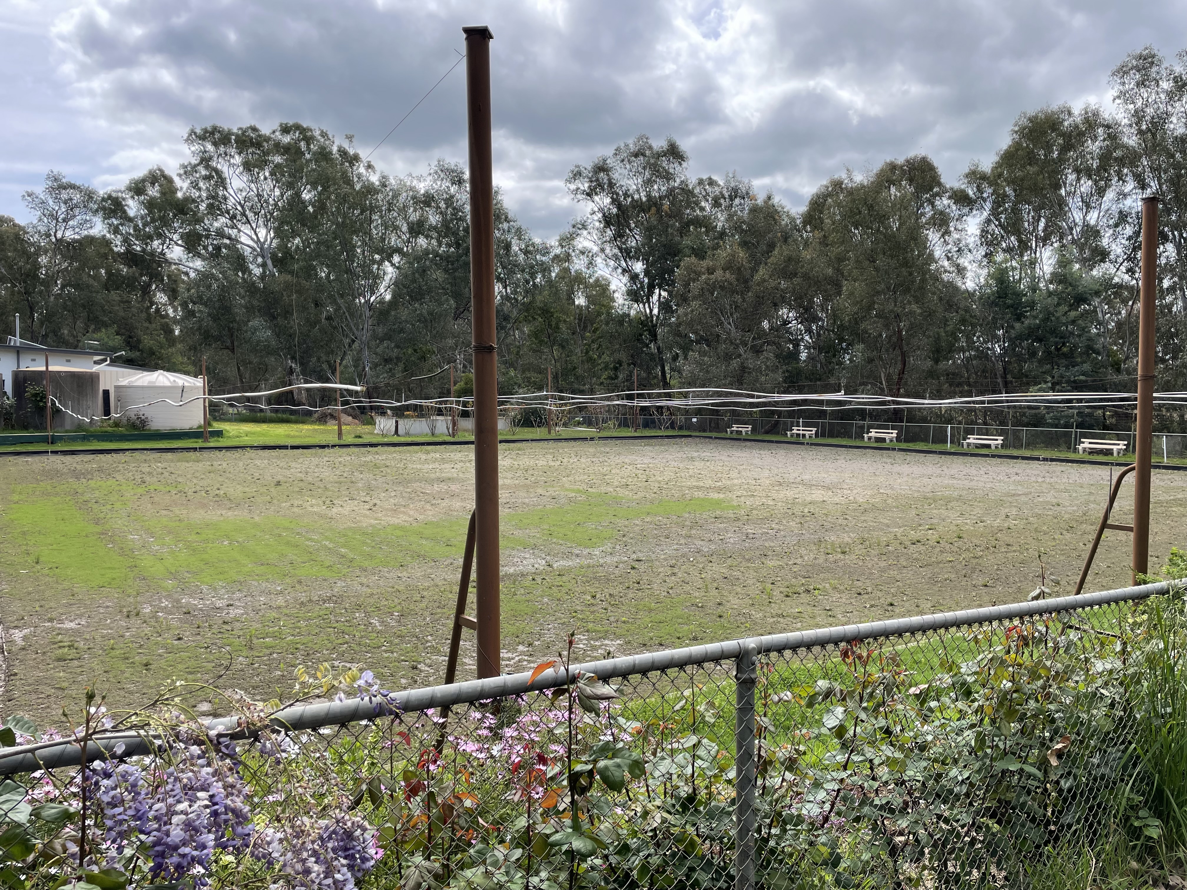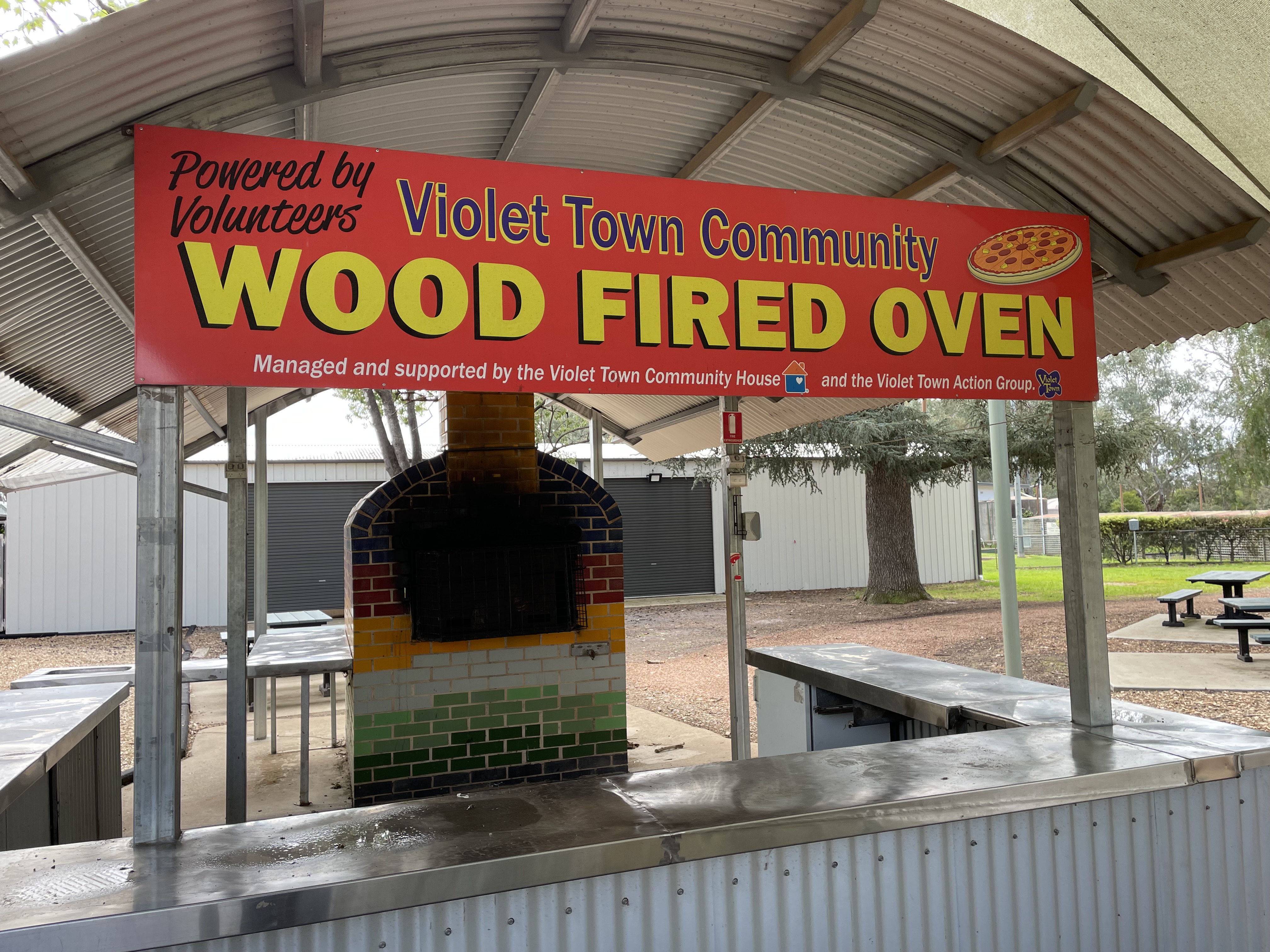 We decided to take a detour through Violet Town. Kim – reading off a list of things to do/see in Violet Town, “there’s the pool”, Kelsie – “Can we go in the pool”, the pool had about 6 inches of water and was green. Sorry, Kelsie not today. They also had a public wood fire bbq, not in service, someone left the roller on the wicket. it looked pretty bogged. And the bowls green has seen better days.