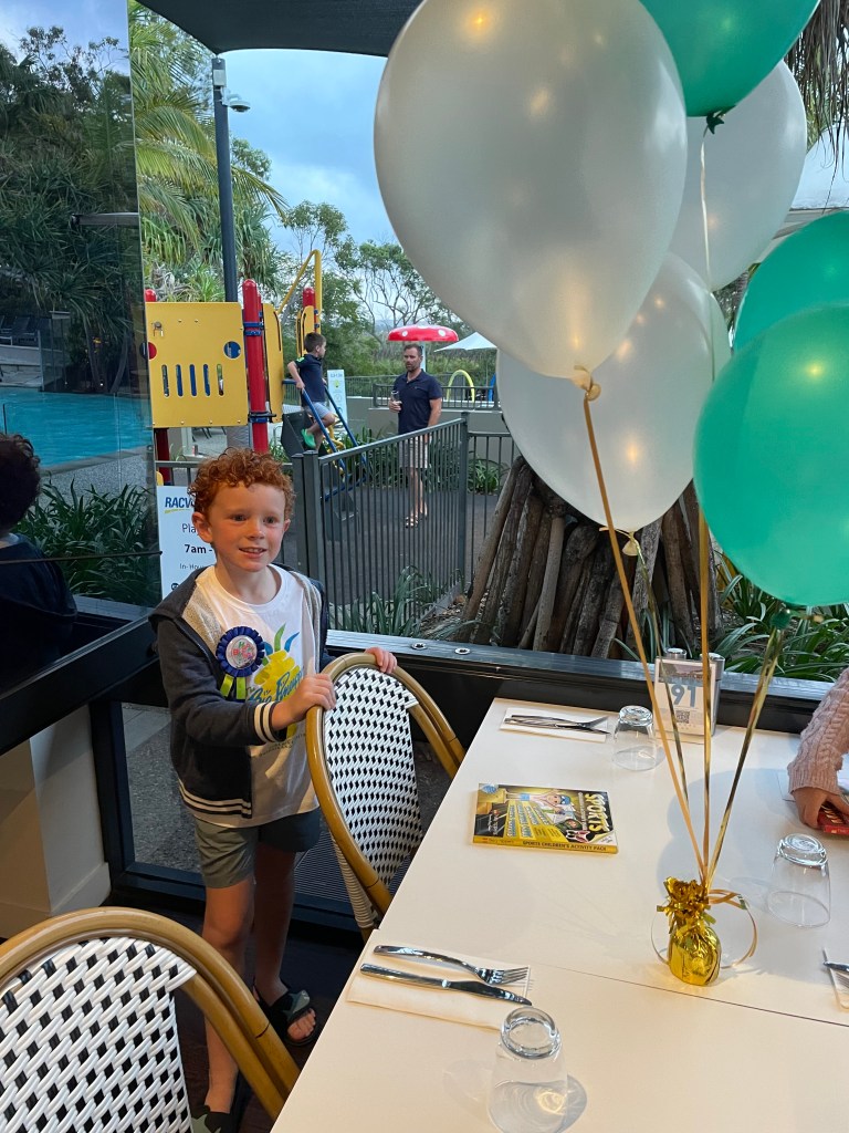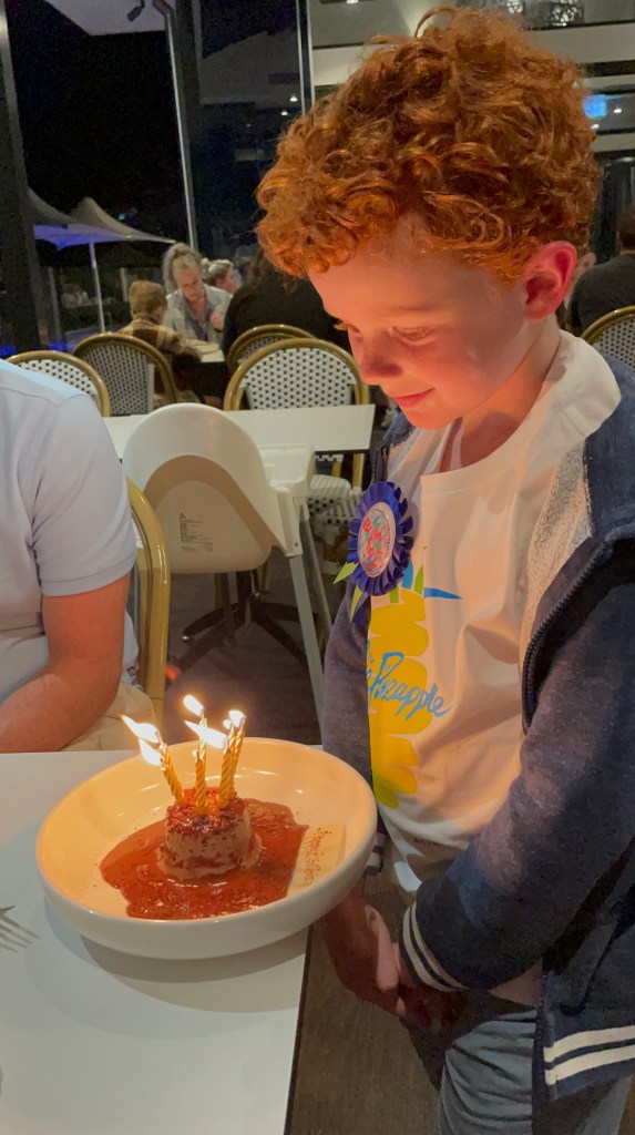Ethan was bitterly dissapointed at dinner. he wanted something special. But with a limited resturant menu and a boy who eats almost exclusively nuggets and chips specail was not on the menu. Then the lack of actual birthday cake (warm chocolate pudding/lava cake) was not in line with birthday expectations. Then to top it all off, his table ballons untied and floated of to the ceiling like his hopes of a perfect day.