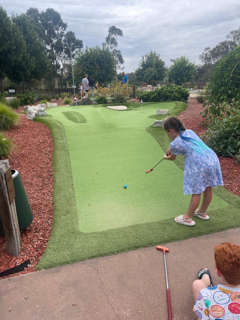 Then mini golf at Rich River Golf Club. Great to see the water feature running for the first time in all our visits. Another first was identifying a rock sculpture as a map of Australia including Tasmania. This started with Kelsie almost losing it over the repellent immune flies. A temporary reprieve when it started to drizzle made life bare able until Kelsie went full circle and befriended 3 of the flies and was encouraging them to hitch a ride on her. Mum and Dad could only raise an eyebrow.
