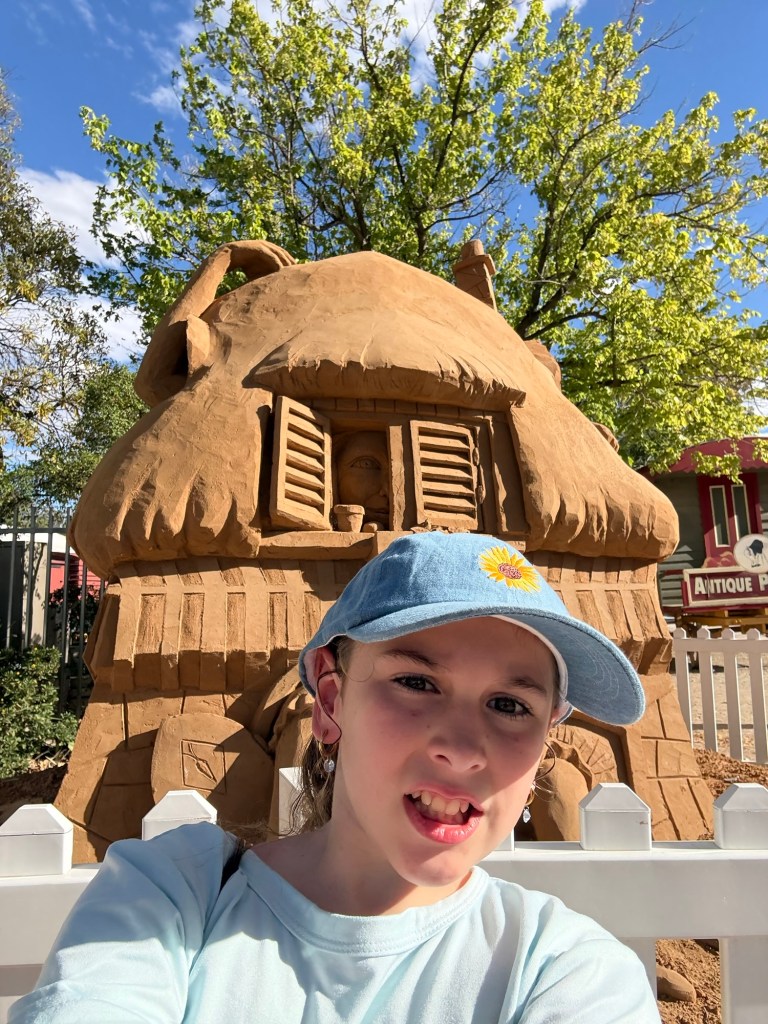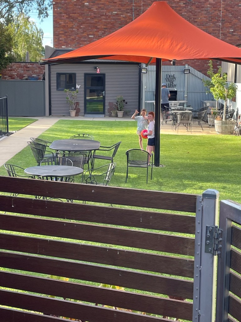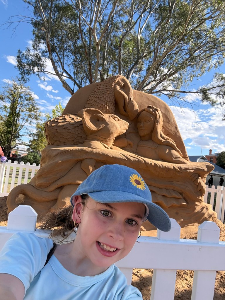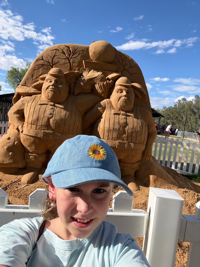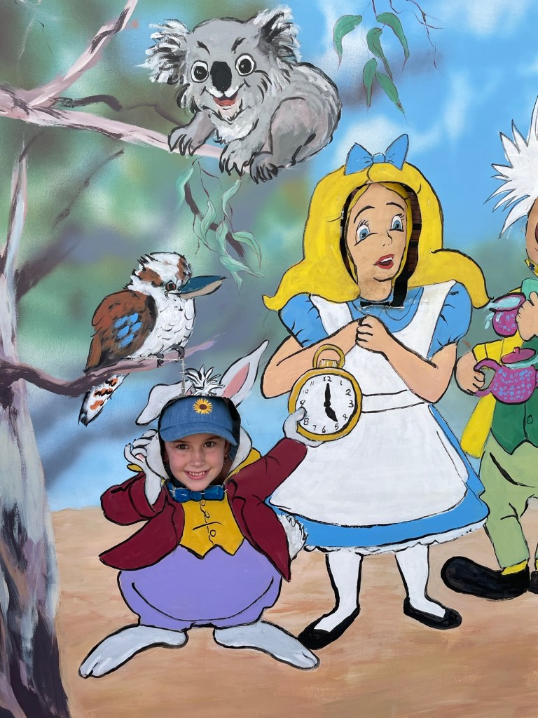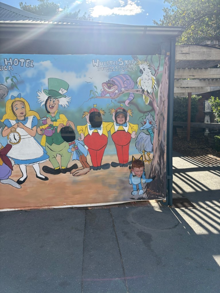 While we waited Kelsie amused herself by taking selfies in front of the Alice in wonderland sculptures. This is a sculpture walk around Echuca that’s on our list of activities. Though 3km walk may be challenge as Ethans legs regularly ‘break’ walking over distances of 200 meters.