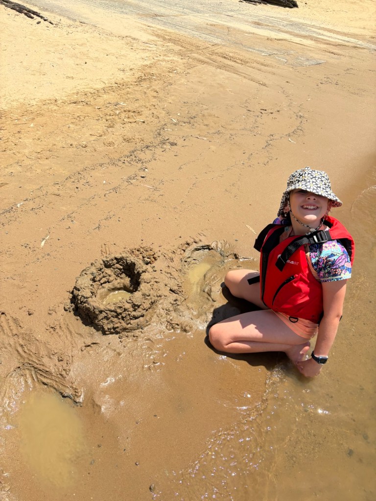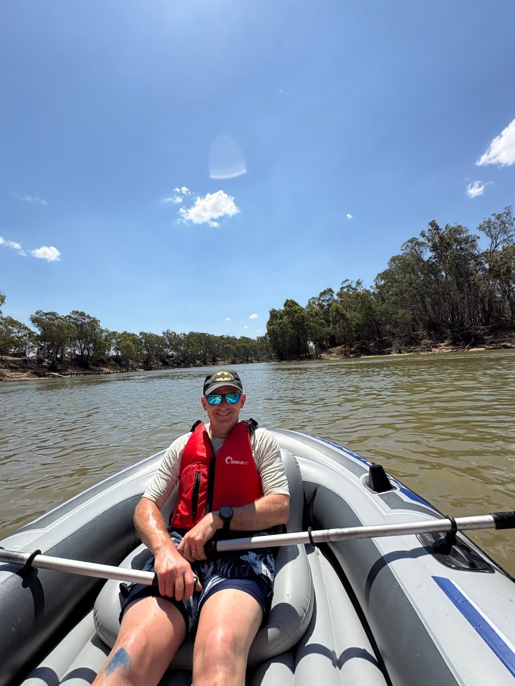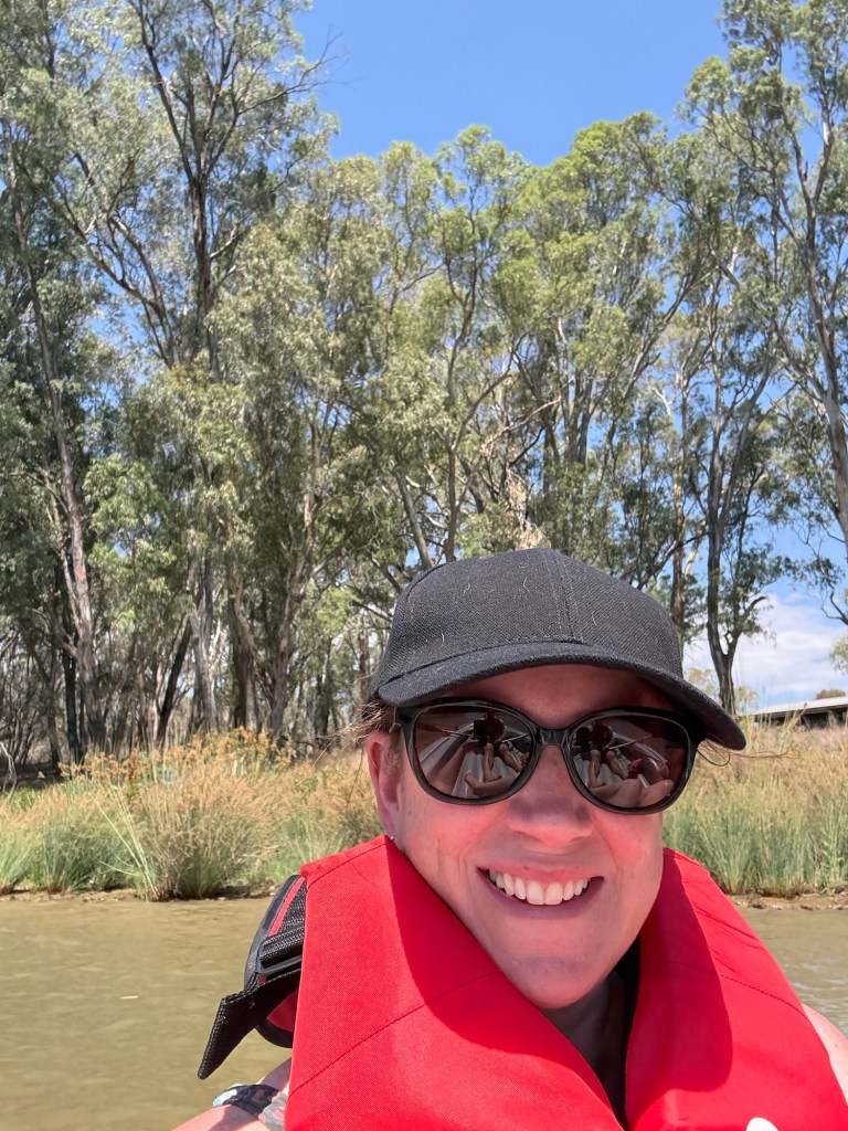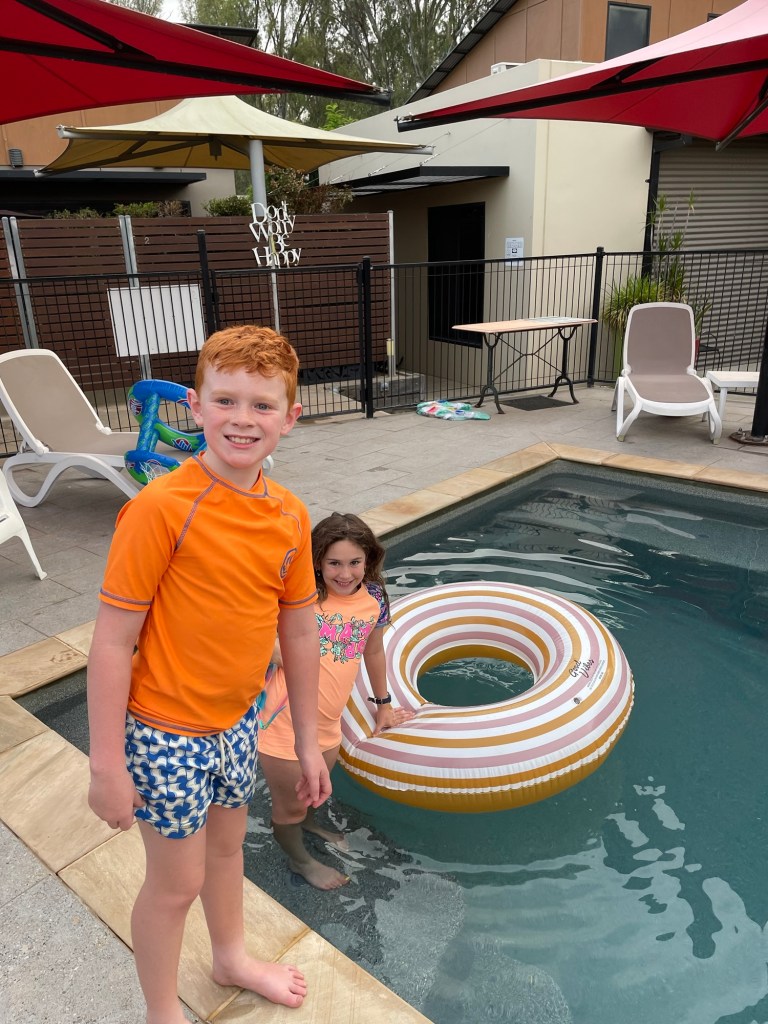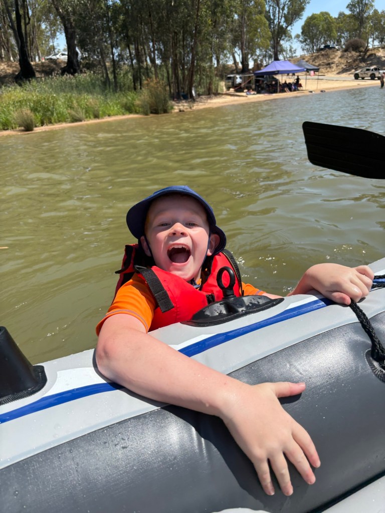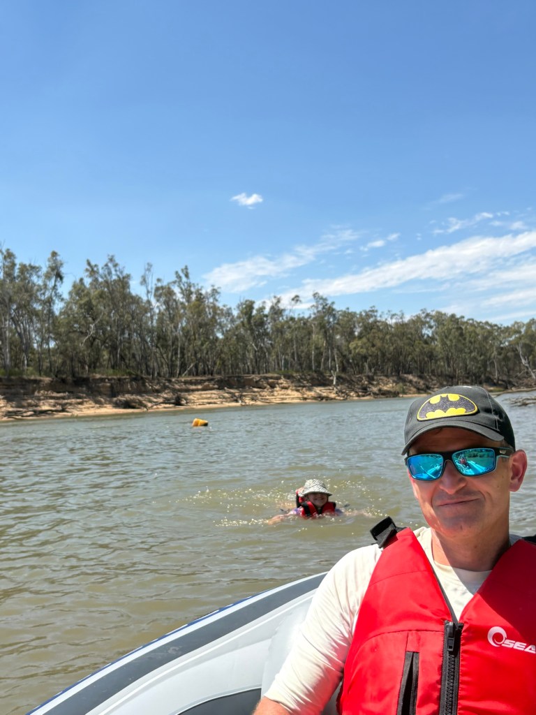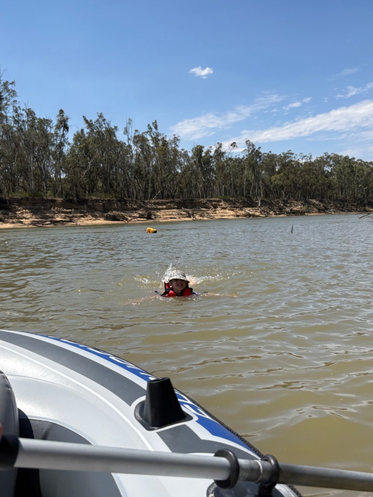 Instead of boating from the Echuca East boat ramp back into the main wharf, we decided to simply mess around in the calm waters of the ramp area and watch the wake boarders and jet-skis zoom up and down the river. Kelsie and Ethan were keen to help row, but found it difficult to find a consistent pattern that wasn’t sending us into the centre of the river, the path of a boat or into the bank. Then they’d crack it for a short while then want another turn. Until Mum said they could both just go overboard and swim in the river. 10 seconds later they were both splashing around in the Murray having a great time. Though there was a time when they were in and out of the boat far too frequently and Dad cracked it that he couldn’t actually row for the constant interruptions. Mum eventually decided that the water looked nice and got in as well. Leaving dad with a row boat in effective sports mode.